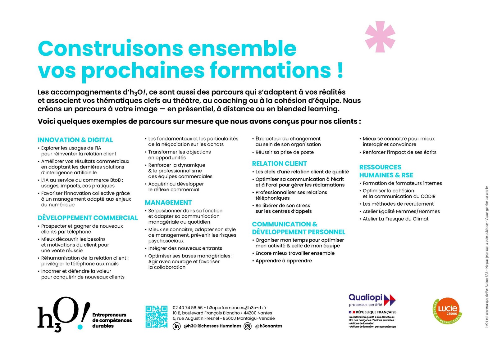 Que vous cherchiez à accélérer votre transformation digitale, engager vos équipes autour du climat ou stimuler l’innovation collective… les formations d’h3O ! sont conçues pour créer un impact immédiat et durable.